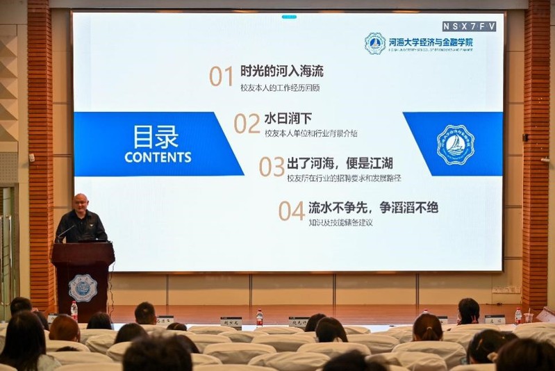 国际经济与贸易专业2007届赵宝龙校友,现任苏州文峰高级中学名誉副校长、AME期刊出版集团办公室主任、杭州医康联科技股份有限公司董事、副总裁。他从自己丰富的职业经历着手,为同学们提供了“地低为海,人低为王的心态调整、内圆外方的品格修养”等四点未来工作的建议。他分享了本人单位和行业背景以及相关行业的发展路径,向在场的同学们展示了一个多元化的职业世界。“流水不争先,争滔滔不绝”,“把握大趋势、专业知识和国际化交流能力、合理利用资源”是赵宝龙校友对同学们给出的知识及技能储备建议。