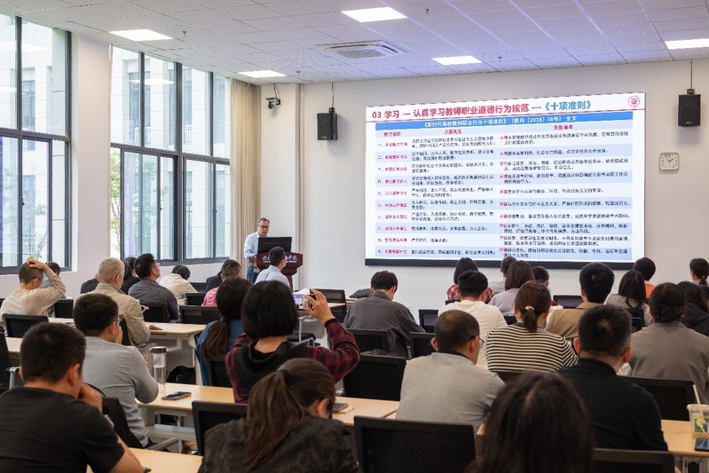 博彩平台 党委书记陈杰领学师德课堂第四期“践行教育家精神,做新时代大先生”专题内容。他强调,教师是立教之本、兴教之源,全体教职工要深刻领会教育家精神的核心内涵,坚守 “心有大我、至诚报国”的理想信念,弘扬“启智润心、甘于奉献”的育人情怀。陈杰重点对《新时代高校教师职业行为十项准则》进行了逐条解读,结合博彩平台 教育教学实际,从政治方向、学术诚信、廉洁自律、关爱学生等方面提出明确要求,他号召全体教师以人民教育家为榜样,在教书育人中展现新时代高校教师的责任担当,争做学生为学、为事、为人的示范。