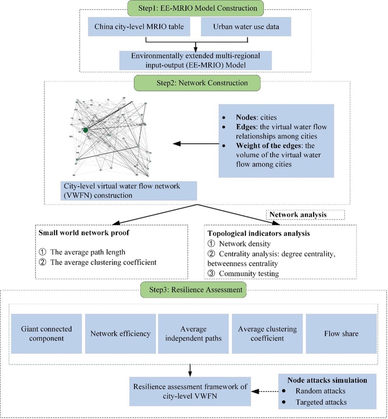 本研究提出了一种基于复杂网络模型与计算机模拟攻击的城市级虚拟水流动网络韧性评估方法。首先,基于复杂网络理论构建黄河流域市级虚拟水流动有向加权网络。其中,黄河流域各城市作为节点,基于环境扩展的多区域投入产出(EE-MRIO)模型计算的城市间虚拟水流作为网络的连边,边的权重用虚拟水流动量(亿立方米)表示。其次,构建虚拟水流网络韧性评估框架,并从网络拓扑和网络流信息等方面选择不同网络指标作为韧性的代理。最后,通过使用Python语言,设计随机攻击和蓄意攻击两种节点攻击策略,以模拟风险冲击下黄河流域城市虚拟水流动网络的韧性指标动态变化过程。虚拟水流的载体是商品与服务贸易,因此可在任何存在贸易活动的区域或行业之间构建虚拟水流网络。此外,本研究构建的韧性评估指标体系基于所建网络的拓扑指标,而非区域特征指标。因此,本文所提出的虚拟水流网络韧性评估方法同样适用于其他区域或行业。研究框架如图1所示。