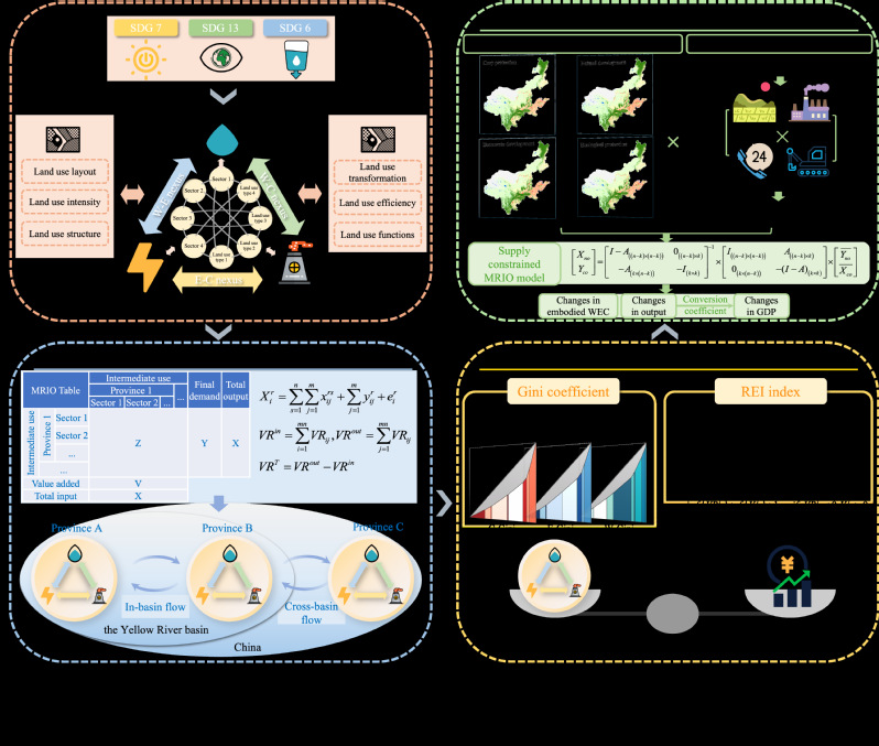 本研究以中国黄河流域为研究区域,构建环境拓展多区域投入产出模型系统追踪了2007-2017年隐含水能碳的本地与跨区域流动,并将土地利用类型与经济部门精准映射,识别不同土地利用类型间的隐含水能碳代谢差异。其次,结合基尼系数与资源环境不平等指数(REI)刻画不同地类隐含水能碳的空间不平等特征。最后,进一步引入斑块生成土地利用模拟(PLUS)模型,预测未来多种土地利用情景,并结合供给约束MRIO模型,模拟隐含水能碳消耗的变化趋势及其经济影响,提出基于地类差异的资源配置优化路径,为流域资源协同调控机制的构建与“双碳”目标的实现提供科学支撑。