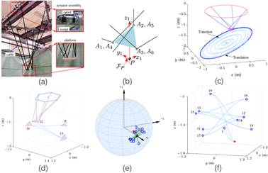 图2. 六自由度悬挂型绳索并联机器人轨迹规划:(a)样机,(b)动平台原理图,(c)周期轨迹,(d)位姿插值,(e)姿态插值,(f)位置插值