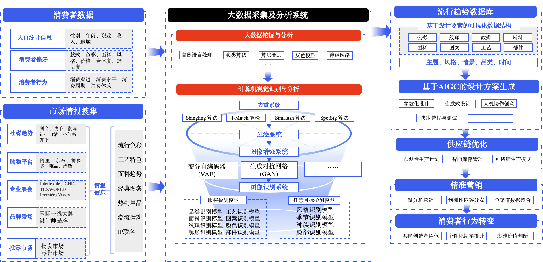 针对行业趋势洞察依赖人工经验、设计周期长、实体展示成本高等核心问题,重点研究基于自然语言处理的流行资讯与消费诉求样本定向获取技术,实现设计灵感的精准溯源;攻关多源数据融合的定量化趋势预测技术,提升研发前瞻性;发展基于生成式AI的纺织品图案与风格内容生成技术,加速创意设计;创新高真实感的动态虚拟试穿与场景展演技术,重构数字营销新模式。旨在推动纺织品开发从“经验导向”向“数据驱动”、从“物理样衣”向“数字先行”的根本性转变。