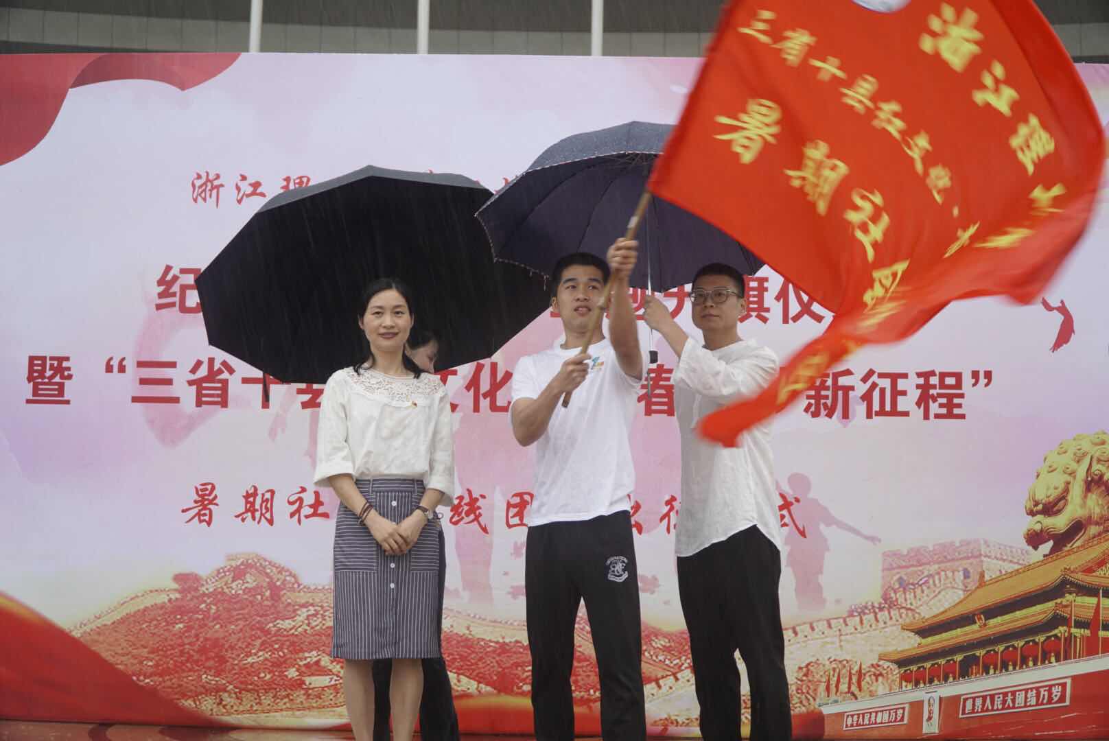 一曲颂歌过后,苏丽辉为实践团授旗,并分别对学生党员和实践团提出希望与要求,随后她宣布“三省十县红文化•青春筑梦新征程”暑期社会实践活动正式启动。滂沱大雨挡不住同学们奋斗的脚步。仪式在大雨中圆满结束,实践小分队奔赴各地开展丰富多彩的暑期社会实践活动。