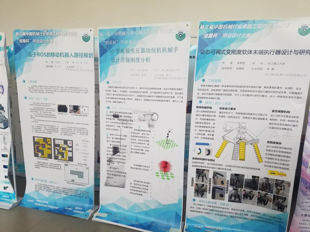 通过正式决赛答辩,李梦雪《姿态可调式变刚度软体末端执行器设计与研究》(校内指导教师:赵德明;企业指导教师:杭州新松机器人自动化有限公司陈鹏)、马培峰《基于ROS的移动机器人路径规划》(校内指导教师:胡明;企业指导教师:金晶)、庞佳丽《小型高频变压器绕线机机械手设计及强度和刚度分析》(校内指导教师:杨景;企业指导教师:黄川)”均荣获本届卓越联盟毕业设计大赛佳作奖。指导教师赵德明老师、杨景老师、胡明老师获得优秀指导教师奖。