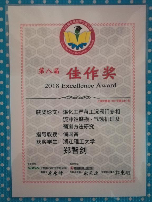 博士生郑智剑(指导教师:偶国富)的博士论文“煤化工严苛工况阀门多相流冲蚀磨损-气蚀机理及预测方法研究”获得佳作奖。
