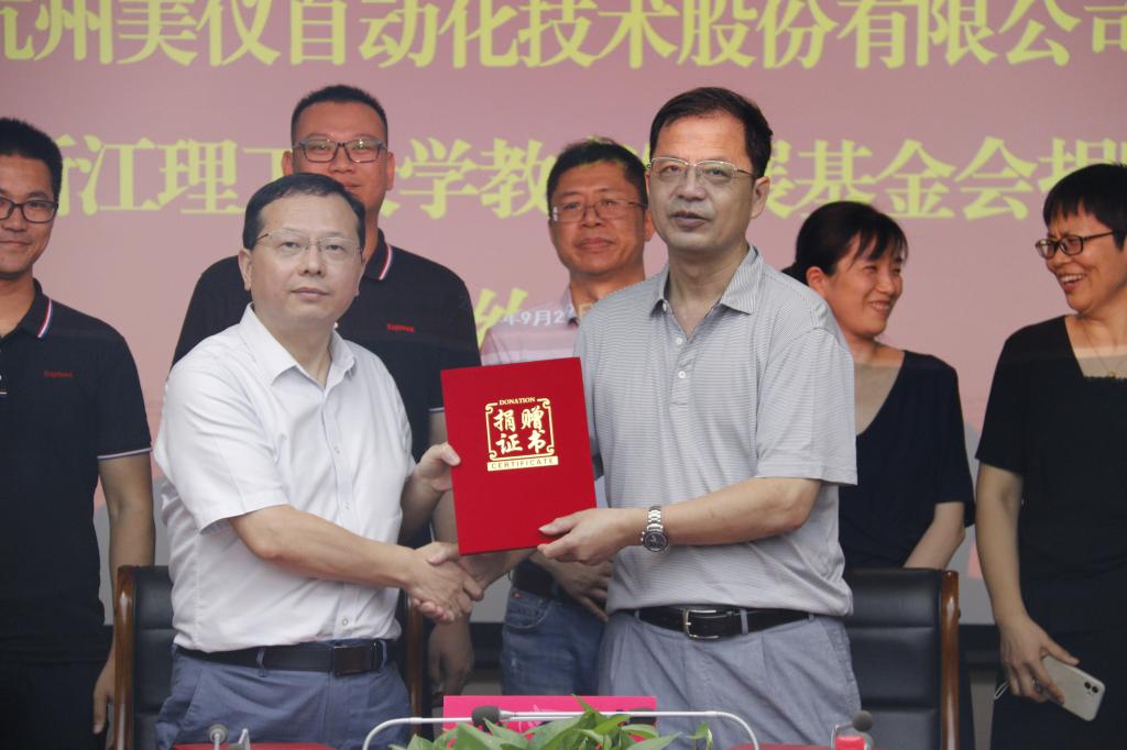 “美仪奖学金”捐赠签约仪式在行政楼215会议室举行。杭州美仪自动化技术股份有限公司董事长丁程一行与浙江理工大学教育发展基金会理事长陈建勇、对外联络办公室主任陈艳、机械与自动控制博彩平台-10大博彩平台网