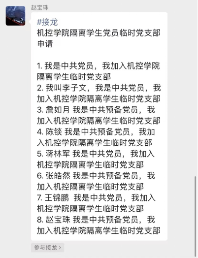 党委提出申请,做到共产党员主动亮身份,担责任,为同在隔离状态的同学提供服务和帮助,发挥党员的先锋模范作用。