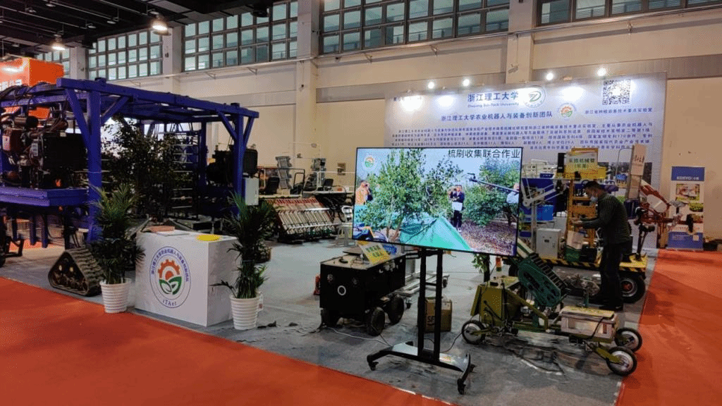 农业机器人与装备创新团队科研成果为主体,现场展出了采茶机、采摘机器人、移栽机、果蔬采收装备等系列样机及产品10余台。农机团队师生40余人以饱满的热情参与了布展及现场接待等工作。当日,浙江理工大学展区吸引了众多与会人员驻足观看咨询,在专业团队的演示和讲解下,现场观众与参展企业表现出浓厚的合作意愿,现场反响强烈。