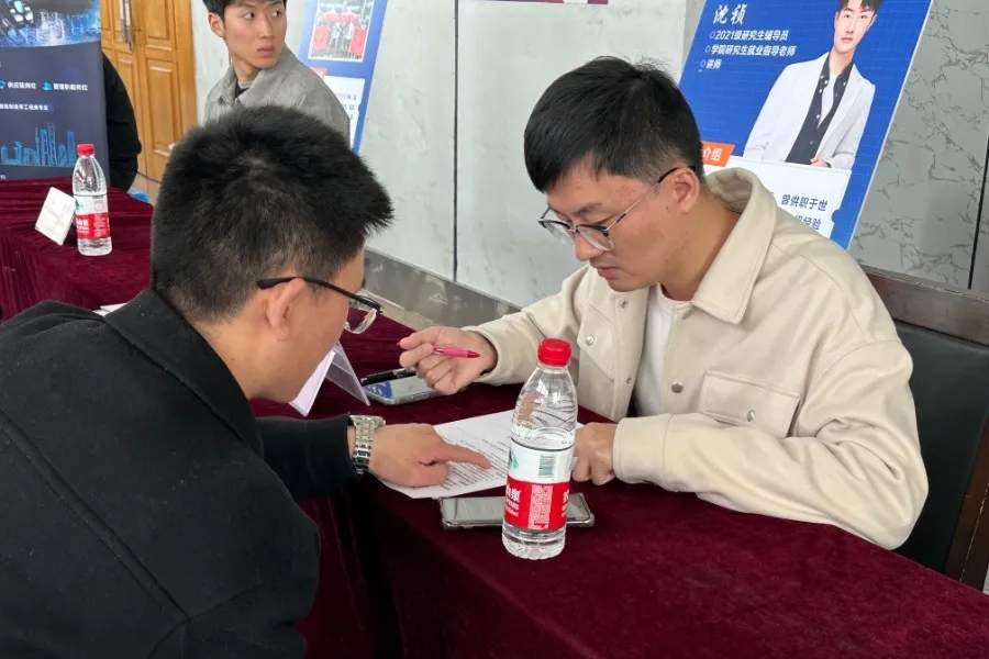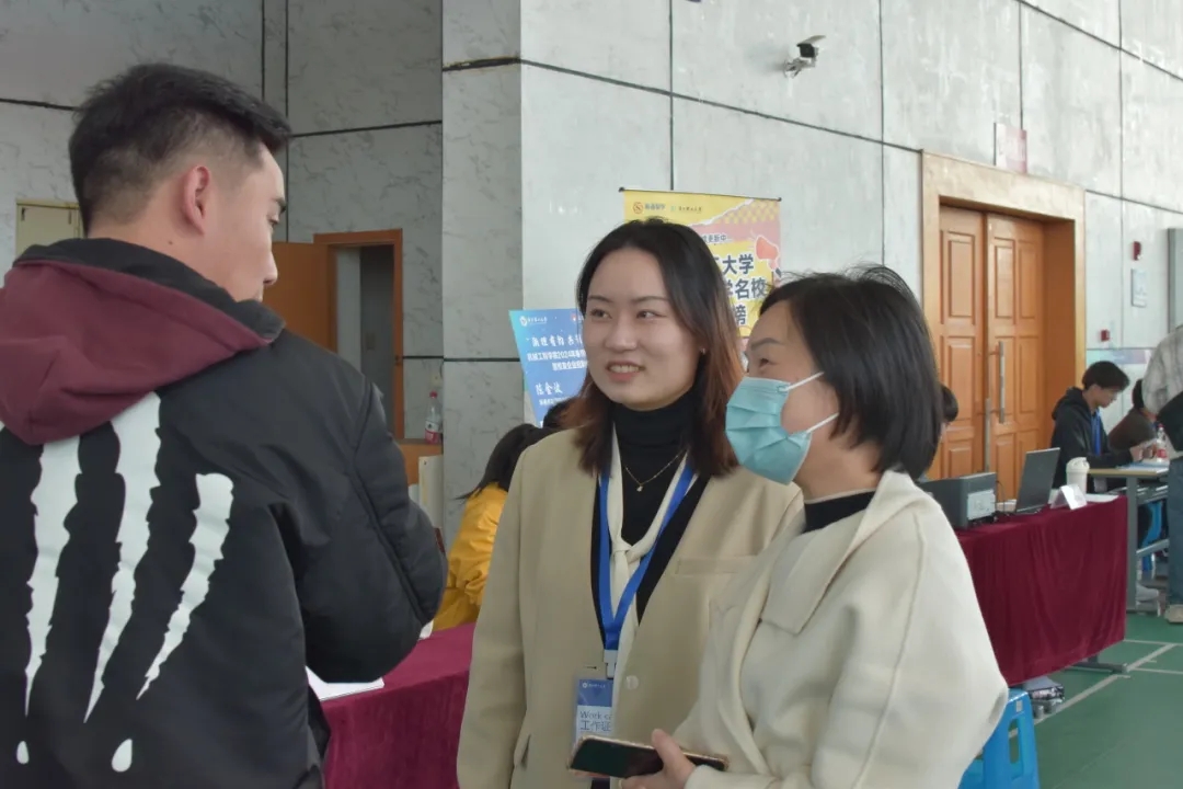 辅导员唐艺林、沈祯前往招聘会,细心地询问招聘单位的详细情况,耐心解答毕业生的问题。